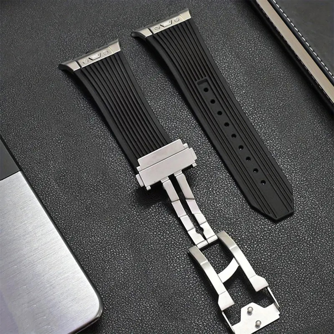 Elevate your Apple iWatch with our Hublot Style Premium Silicon Strap with Titanium Finish Buckle, featuring a sophisticated titanium buckle for the ultimate blend of style and durability.